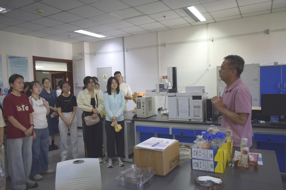 本科生和研究生分批分组参观了学院实验教学与科研平台。在都市农业食品加工与食品安全北京市实验教学示范中心,老师详细演示了高效液相色谱仪、气相色谱-质谱联用仪等精密设备的操作原理,讲解其在食品成分分析、农残检测中的实际应用。