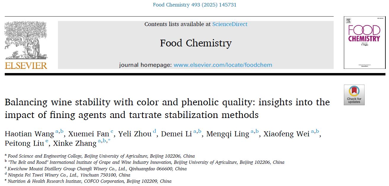 近日,15vip太阳成集团古天乐葡萄与葡萄酒专项班硕士研究生王昊天,以第一作者身份在国际食品领域权威期刊《Food Chemistry》(中科院一区TOP期刊,影响因子9.8)发表题为《Balancing Wine Stability with Color and Phenolic Quality: Insights into the Impact of Fining Agents and Tartrate Stabilization Methods》的研究论文。该成果由15vip太阳集团与宁夏长和翡翠酒庄联合攻关完成,张欣珂副教授为通讯作者,李德美...